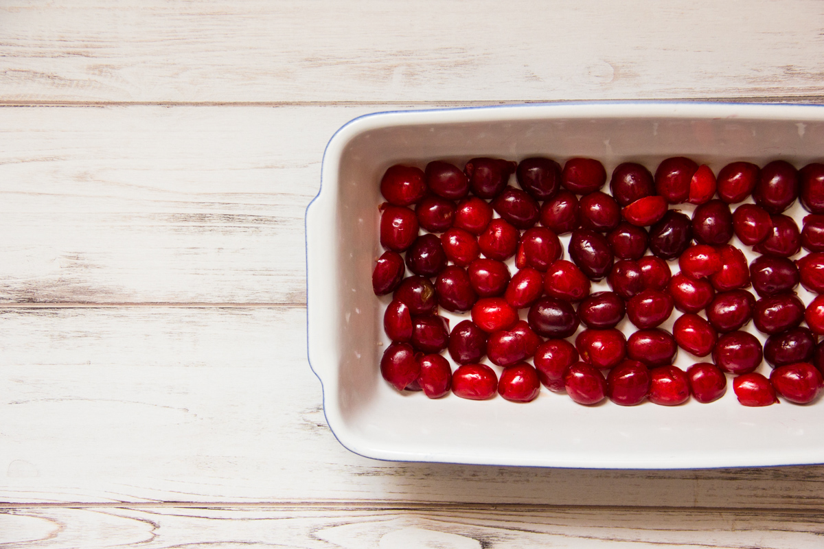 Imburra e infarina una teglia (20 cm di diametro o 20 x 15 cm se rettangolare), e disponi le ciliegie ordinatamente sul fondo della teglia.
