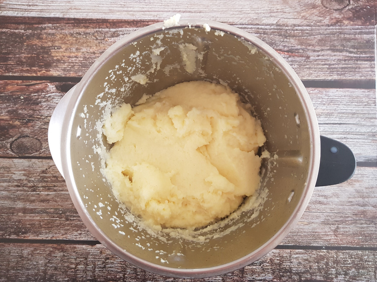 Quando il composto è tiepido, monta le uova con 170 g di zucchero, la ricotta, l'aroma di vaniglia e la buccia di limone e arancia grattugiate.