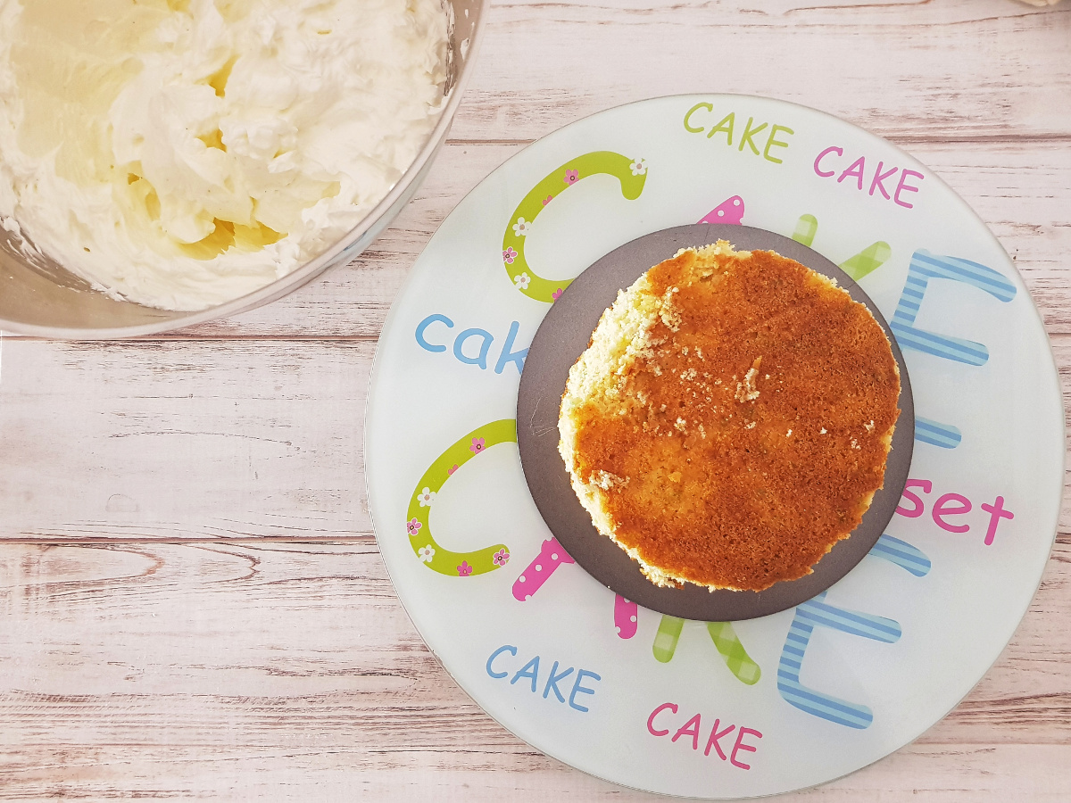 Aggiungi la seconda torta e glassala con la crema al burro aiutandoti con la spatola.