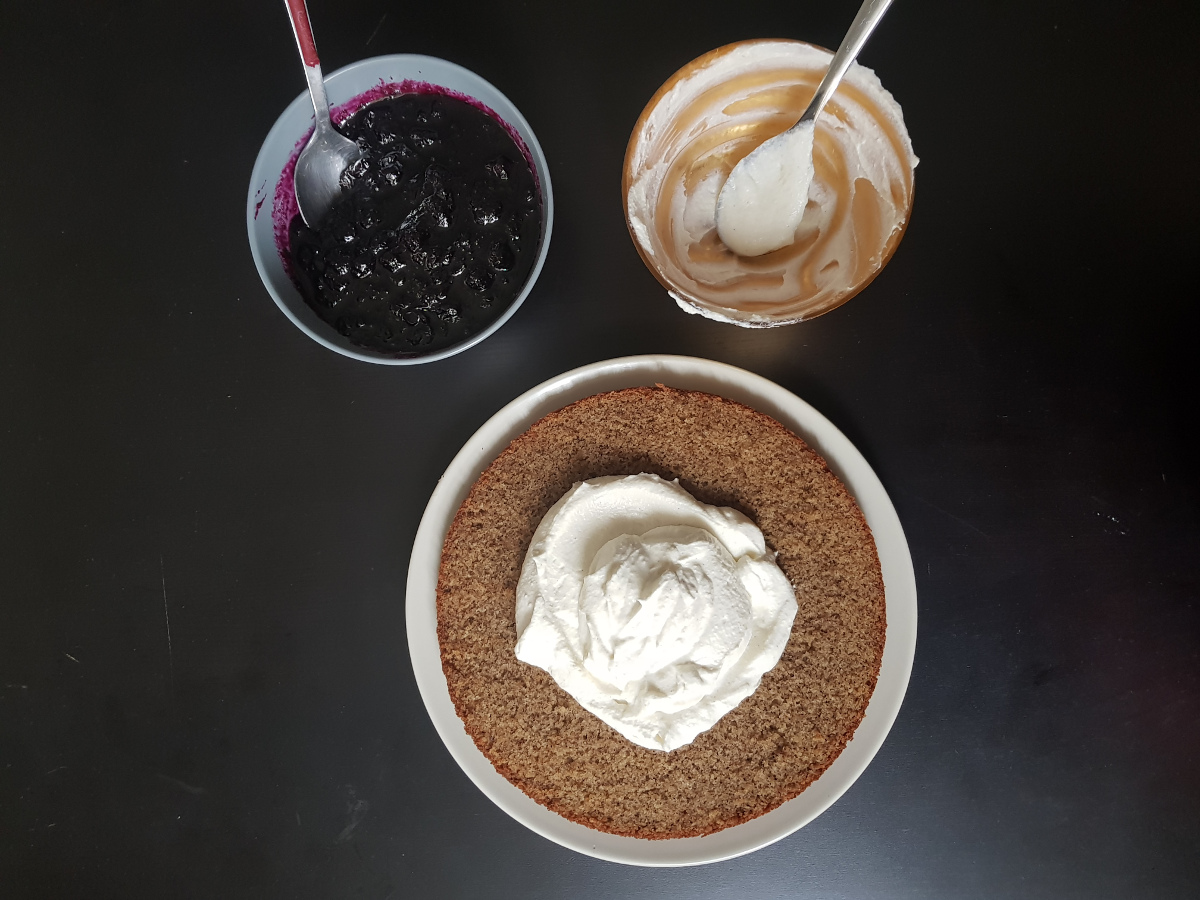 Questa torta al grano saraceno, crema di ricotta e confettura di mirtilli è stato il primo dolce preparato dopo due mesi di stop forzato. E’ una torta deliziosa, equilibrata e non troppo dolce.