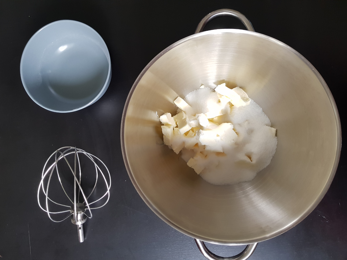 Monta con le fruste elettriche il burro con lo zucchero fino ad ottenere una crema.